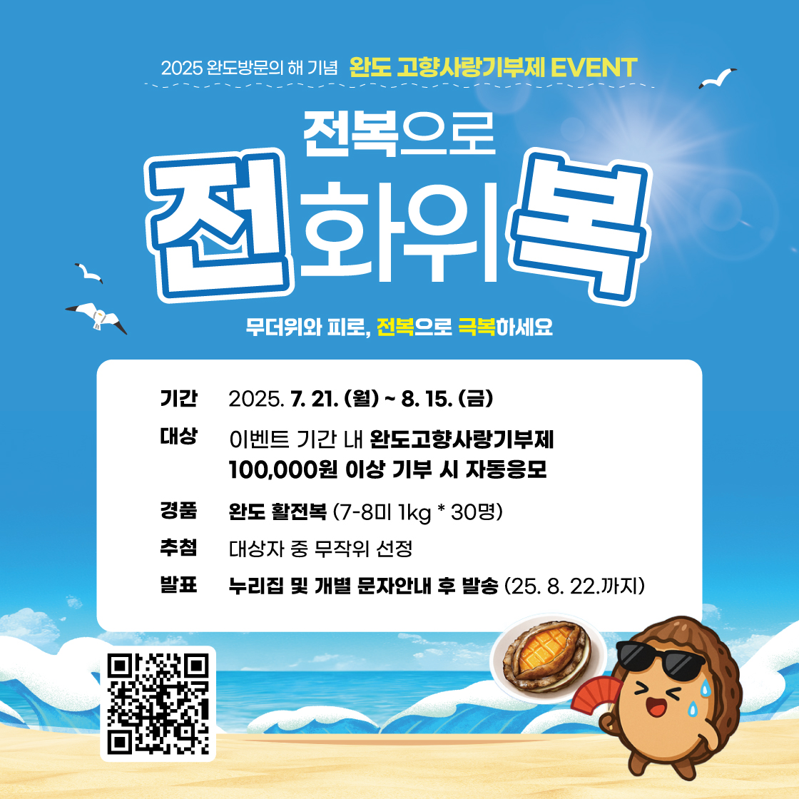 2025. 7. 21.(월) ~ 8 . 15.(금)까지 시행한 완도고향사랑기부제 이벤트 당첨자(30명)를 아래와 같이 안내 드립니다.
